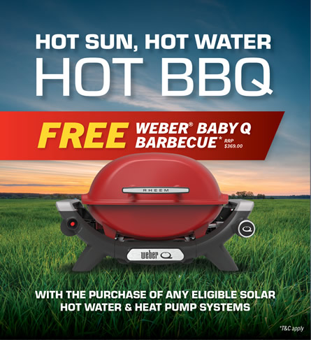 HOT SUN : HOT WATER : HOT BBQ Trade-in your current hot water system for any size new Rheem Solar Hot Water System or Heat Pump and get a Rheem Weber Baby'Q' BBQ. Valid from 1st March 2025 to 31st May 2025